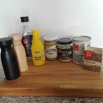 - Throw in the tahini, cumin seeds, garlic, lemon juice, salt, pepper and olive oil and switch on the blender.