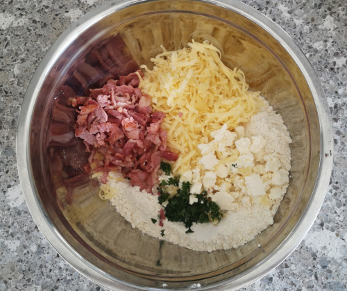 - Chuck the flour, baking powder and salt in a large bowl. Mix together and rub in the butter.